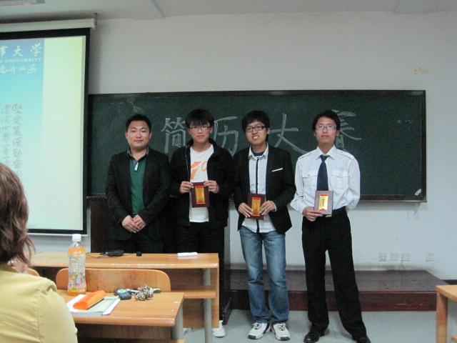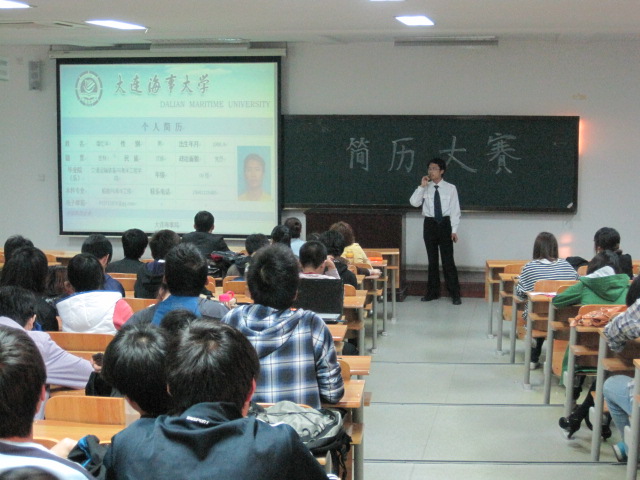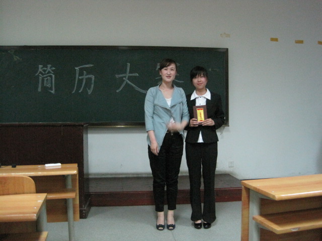 比赛通过播放PPT的形式,让每位参赛选手将自己设计的简历展示出来。选手展示PPT的同时,要为作品进行简短的讲解,之后由评委老师进行相关的点评。首先上场的是苏鑫同学,他设计的简历独具风格,焕然一新。评委老师在赞许简历创新性的同时还指出了简历当中存在的一些问题。李天培同学的简历富有条理性,用简单明了的方式将内容展现出来,让人一目了然,而这也博得了评委老师的好评。当然,针对简历中语言的使用及分类事项,评委老师还是提出了改进的建议。刘璐瑶同学经过精心准备,一上场就吸引住了众人眼球。她的简历简洁而精美,风格独特,充分地突出了主题,给人一“简”钟情的感觉。最终,凭借优秀的设计及良好的精神风貌,刘璐瑶力压其他选手,夺得此次大赛一等奖。选手范伟同、李天培同获二等奖,苏鑫、乐源、潘红样获得三等奖。